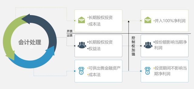 若被投资企业为公司,通行的行业操作惯例一般认为长期股权投资的持股比例为20%-50%,可供出售金融资产的持股比例为5%-20%。因此于通常情形而言,从可供出售金融资产到长期股权投资再到合并报表,上市公司对并购基金的控制权逐渐加强。