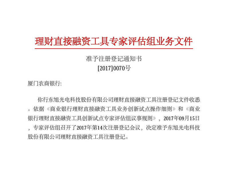2017年10月9日,中国银行业监督管理委员会理财直接融资工具专家评估组出具【2017】0070号《理财直接融资工具准予注册登记通知书》,准予厦门农村商业银行股份有限公司(以下简称“厦门农商行”)作为发起管理人的东旭光电科技股份有限公司理财直接融资工具注册登记。