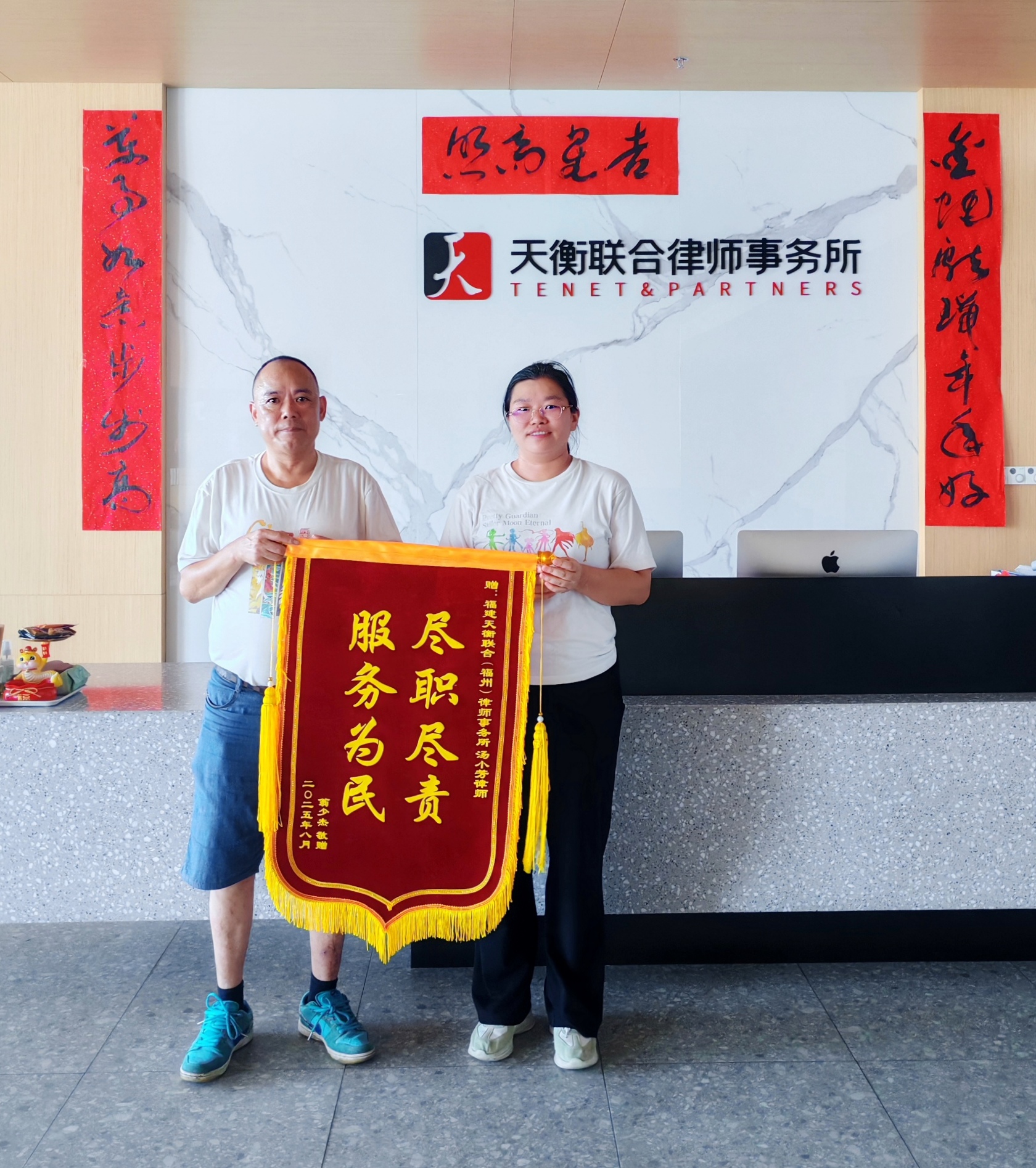 近日,福建天衡联合(福州)律师事务所的汤小芳律师收到了当事人翁先生赠送的锦旗。锦旗上“尽职尽责,为民服务”八个字,字字凝聚着真挚情感,既是对汤小芳律师在为其维权服务过程中专业细致、全力以赴的高度肯定,同时也是对天衡优质服务的赞扬。